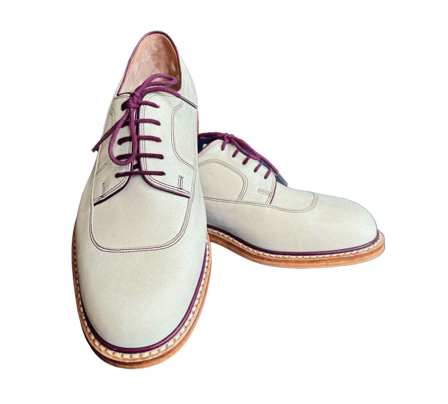 Model, który jest bardzo nietypowy, oparty na kontrastach, mających się wpasować do luźnych, lekkich, letnich stylizacji. Cholewki wykonane są z jasnego kremowego nubuku, który bardzo dobrze koresponduje z wykorzystaną do szycia bordową nicią i skóra, użytą na wykonanie biz przy obłożynach. Buty są uszyte perełką z bizą dookoła buta, przy tak grubej podeszwie, która po wypaleniu przekracza 1 cm grubości, zdecydowaliśmy się tutaj na wykonanie wyższych obcasów niż klasycznie, są podwyższone o o,5 cm. Co powoduje, że ta para przy swej lekkości, pozostaje jednak lekko masywna.